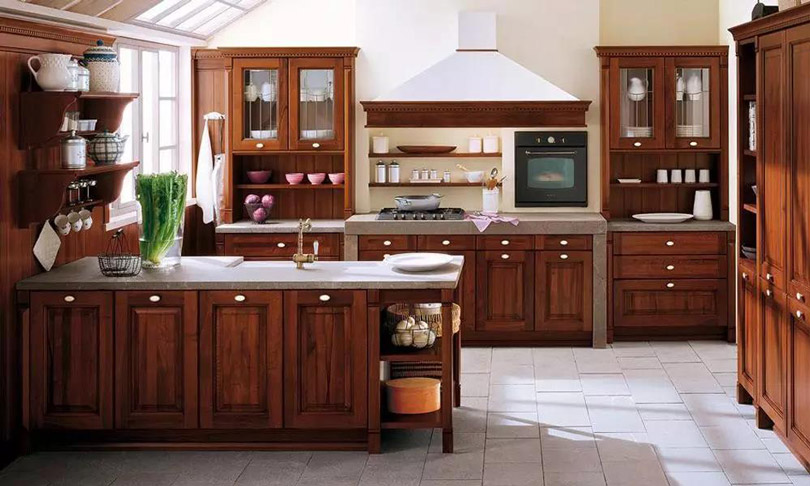 使用實(shí)木制作櫥柜門(mén)板,風(fēng)格多為古典型,美式、中式家居風(fēng)格中比較常見(jiàn),以櫻桃木色、胡桃木色、橡木色為主。