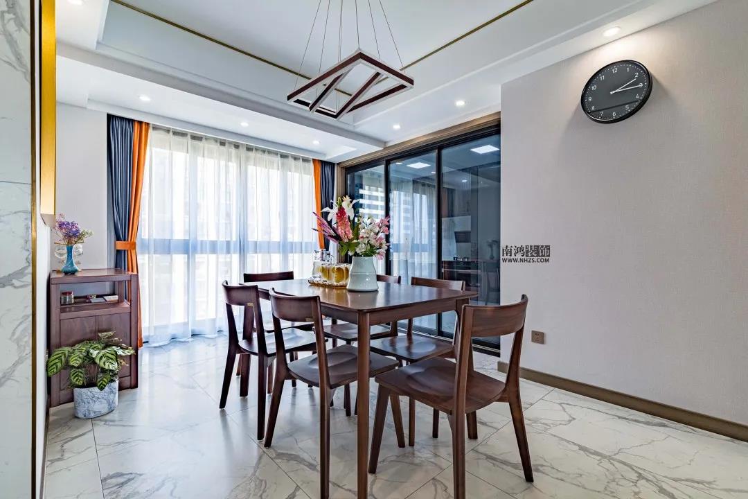 戶 型 圖 設(shè)計說明: · 玄關(guān)口的次臥門改動,側(cè)面做了鞋柜; · 餐廳與客廳均包進陽臺,擴大使用面積; · 改動客衛(wèi)墻使餐廳開間增大,衛(wèi)生間做干濕分離; · 原結(jié)構(gòu)圖中的一間書房一分為二,做了主臥的走入式衣庫和北臥的學(xué)習(xí)區(qū)。 入戶過道放置銀色方柜,勾勒金色線條與背景墻、頂面呼應(yīng),明黃的花色和虎皮蘭的綠意為家里引入蓬勃的生機。 客廳通鋪大理石地磚,簡單的頂面采用香檳色不銹鋼線條走邊,橙黃+深藍的軟裝色彩搭配令人眼前一亮。 客廳納入陽臺,拓展了使用空間。原木的組合式茶幾與電視柜呼應(yīng),大理石的電視背景墻結(jié)合木飾面,提升空間質(zhì)感。 客廳望向餐廳視角,內(nèi)外通透,視線流暢。 納入客廳的陽臺空間被打造成休閑區(qū),一旁擺放了花盆架,儼然是一處消解疲憊、享受愜意的清新小花園。 餐廳,黑胡桃木的餐桌椅溫潤質(zhì)樸,展現(xiàn)出低調(diào)的姿態(tài),墻上一幅簡框畫營造出溫馨輕松的就餐氛圍。 泡一杯清涼解暑的檸檬茶,品味生活的獨特滋味。 廚房,白色瓷磚搭配深灰色木質(zhì)櫥柜門,內(nèi)嵌現(xiàn)代廚電和雙門冰箱為屋主每日下廚提供便利。 臥室色彩柔和,灰紫色的硬包背景不加過多修飾,藍粉搭配的窗簾為房間注入清爽氣息,明亮光線帶來整室的溫暖。 客衛(wèi)干區(qū),區(qū)別于以往的硬墻式隔斷,設(shè)計師使用不銹鋼配夾絹玻璃的隔斷形式,令這方空間增色不少。高顏值臺上盆搭配圓框鏡,更顯時尚。 衛(wèi)生間內(nèi),木質(zhì)臺盆柜組合黑色五金件,簡單利落,鏡柜設(shè)計了收納格方便日常使用。淋浴區(qū)專門開鑿了壁龕,增加儲物空間。 | 地址:沾橋新苑 | 面積:160㎡ | 風(fēng)格:現(xiàn)代輕奢 | 設(shè)計施工:浙江南鴻裝飾