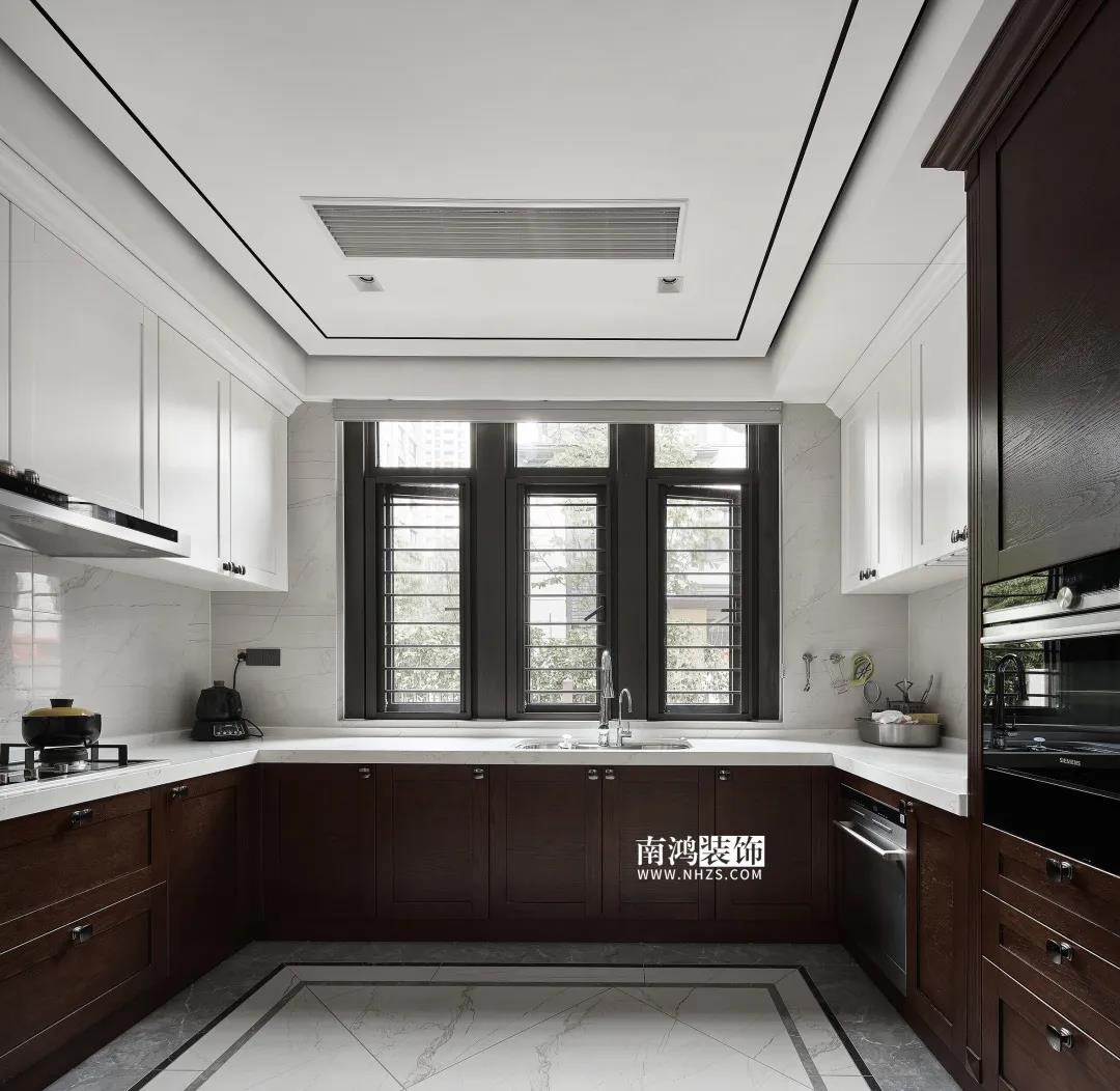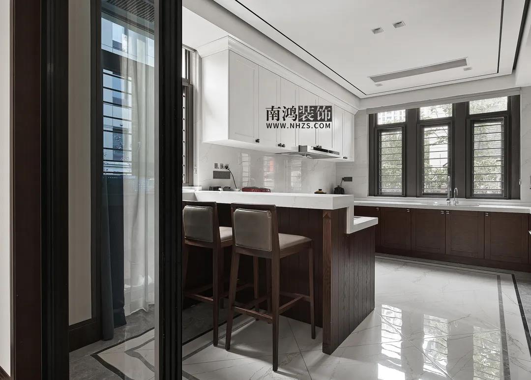 廚房,白色吊柜搭配木質(zhì)地柜,細致莊重,現(xiàn)代化的內(nèi)嵌廚電打造出設(shè)備齊全的料理空間,靠門一側(cè)還設(shè)計了吧臺。
