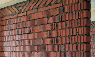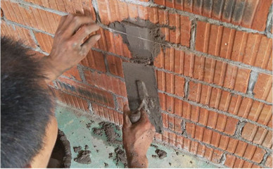 新砌墻體頂部九五磚雙向斜切磚縫抹灰均勻(嚴(yán)禁多孔磚側(cè)向砌筑)